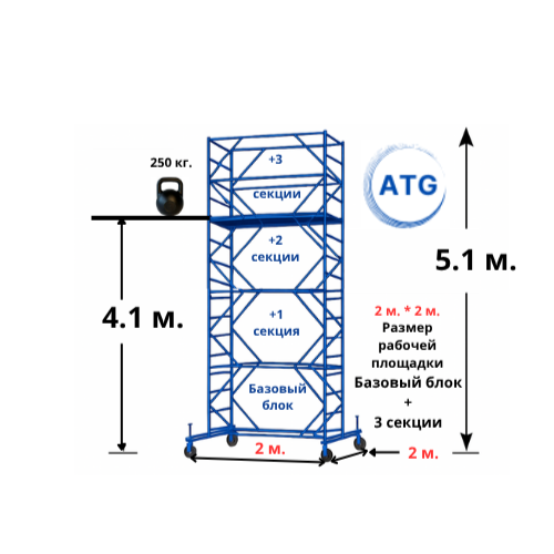 Вышка тура ATG Базовый блок + 3 секции. Высота 5,1 м. Размер рабочей площадки 2*2